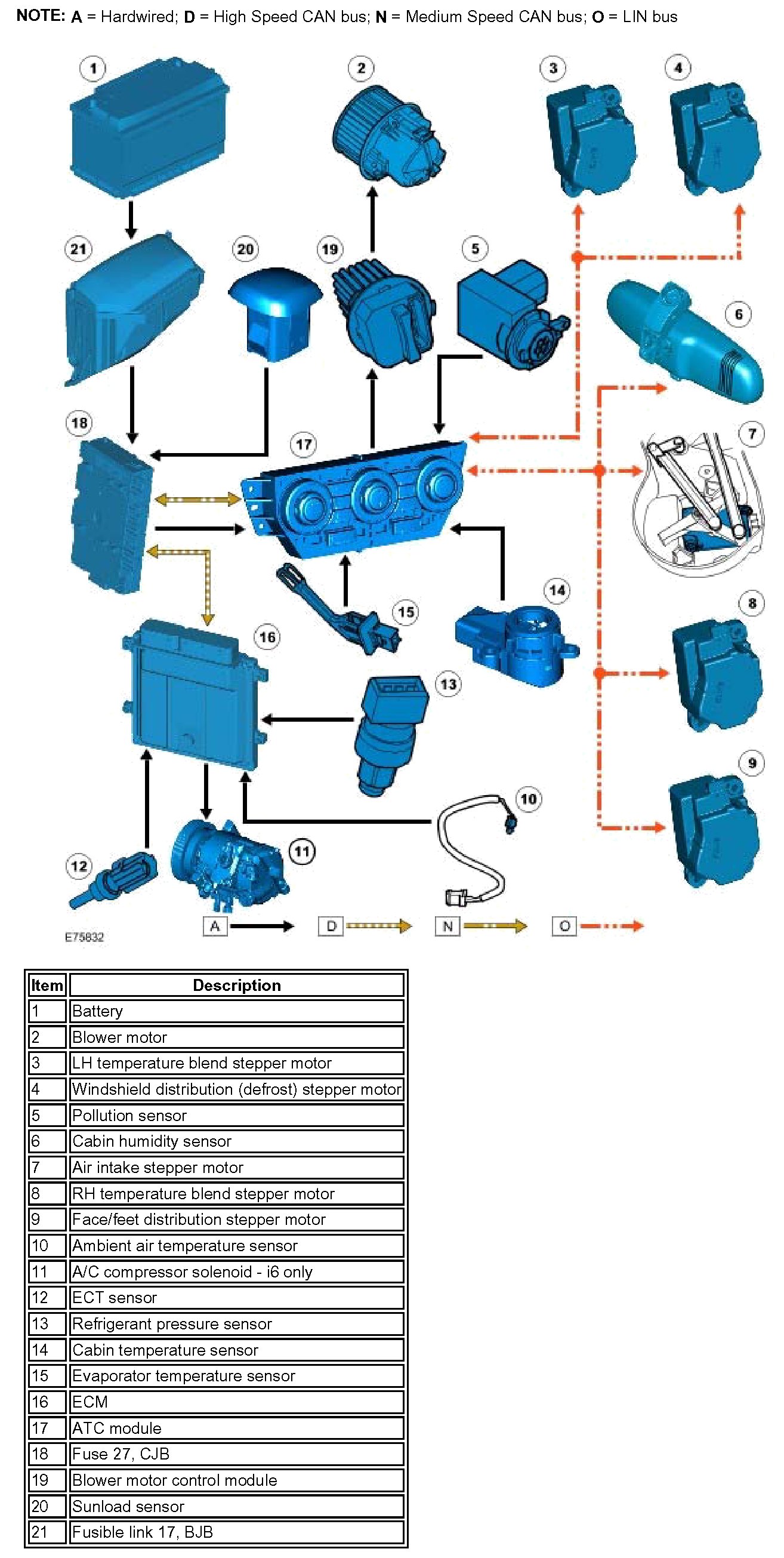 The solar heating value is transmitted from the CJB to the ATC module over the medium speed CAN bus. The ATC module compensates for the solar heating effect by adjusting blower speed, air output temperature and air distribution to maintain the required cabin temperature.
