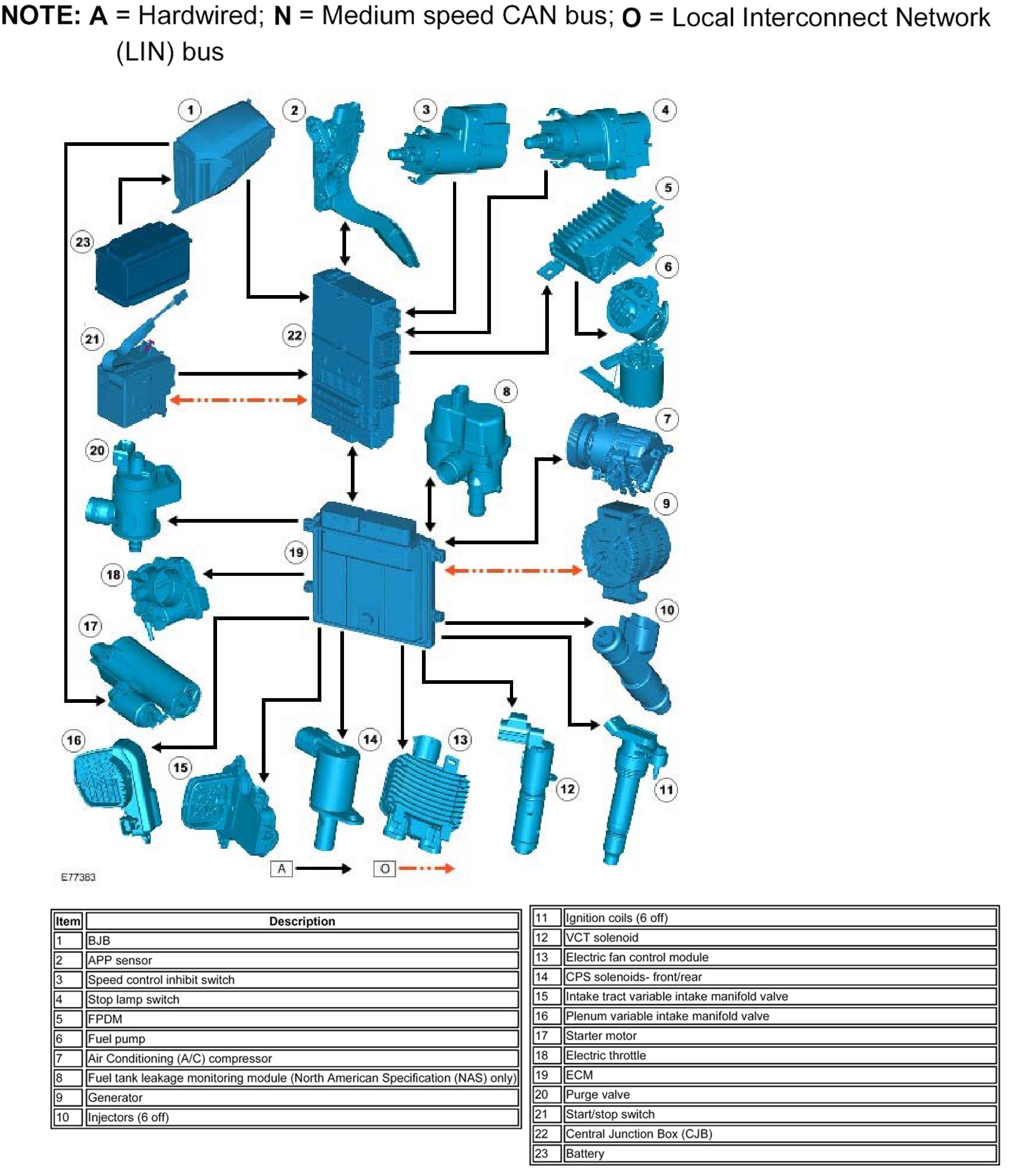 The ECM uses a torque-based strategy to generate the torque required by the driver and other vehicle control modules. The ECM uses various sensors to determine the torque required from the engine. The ECM also interfaces with other vehicle electronic control modules via the high speed Controller Area Network (CAN) bus, to obtain additional information (for example road speed from the Anti-lock Brake System (ABS) module). The ECM processes these signals and decides how much torque to generate. Torque is then generated by using various actuators to supply air, fuel and spark to the engine.