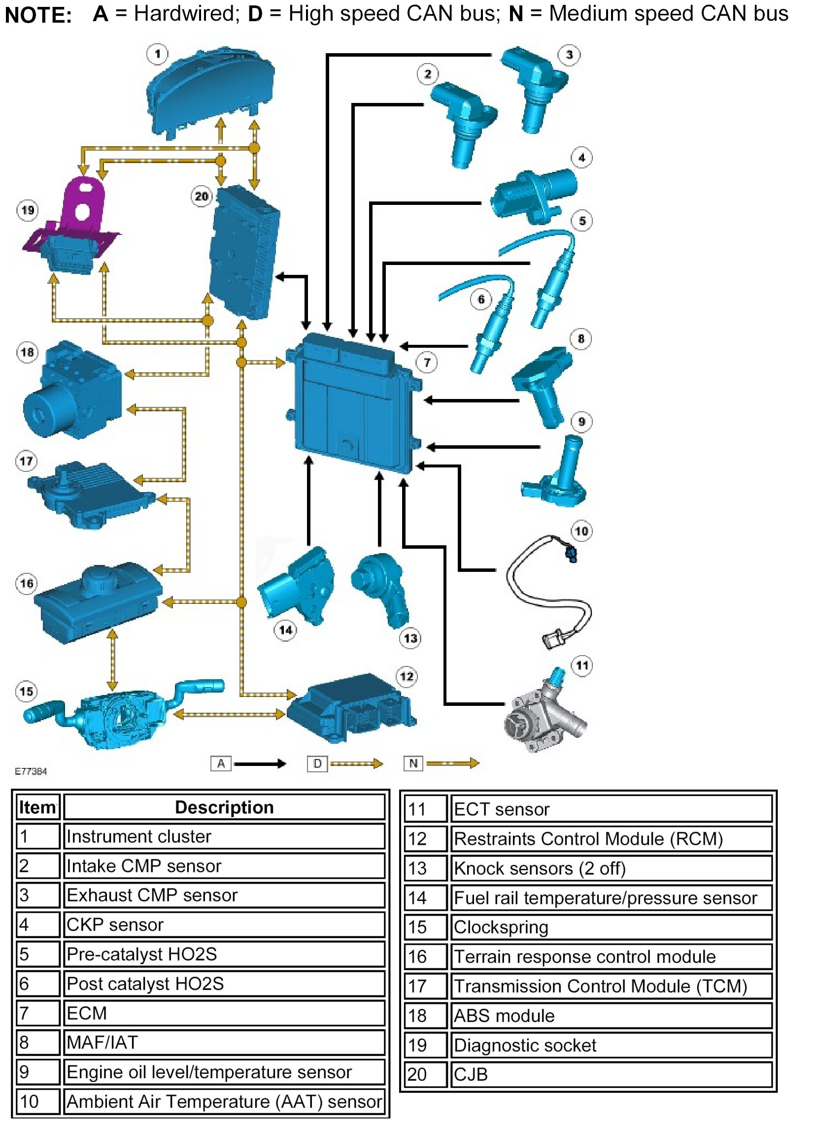 The ECM monitors the sensor for correct function and can diagnose and store fault codes for sensor faults. These can be retrieved using a Land Rover approved diagnostic system.
