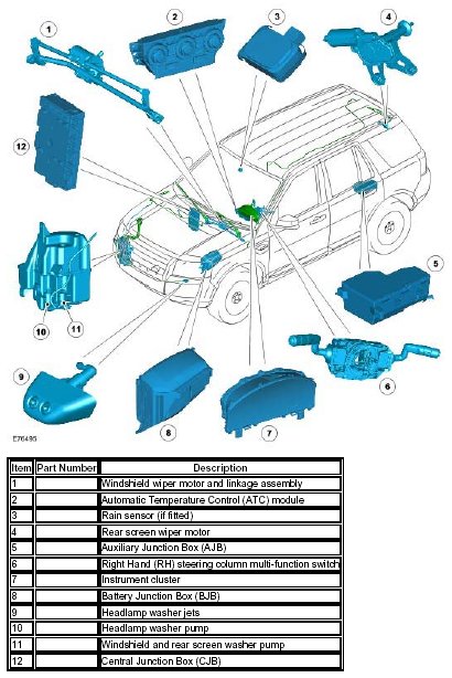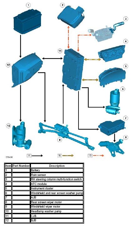 The wiper and washer system can operate in a number of different ways when the vehicle is in power mode 4 through 8. Requests from the RH steering column multi-function switch are transmitted over the LIN bus to the CJB, which is the main controller for the system.