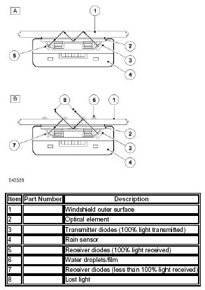 The 'Auto' function requires an input from the rain sensor. The rain sensor is mounted on the inner surface of the windshield and transmits an infra-red signal to determine the amount of water on the outer surface of the windshield. A value is then transmitted to the CJB over the Local Interconnect Network (LIN) bus.