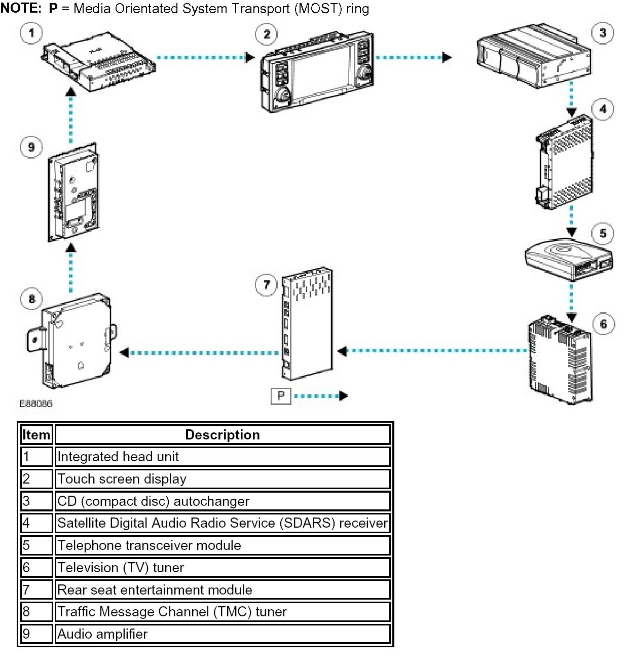 The MOST ring uses fiber optic cables to transport data and audio signals around the information and entertainment system.The fiber optic cables are arranged in a ring, with each unit on the ring having a 'MOST in' and 'MOST out' connection.