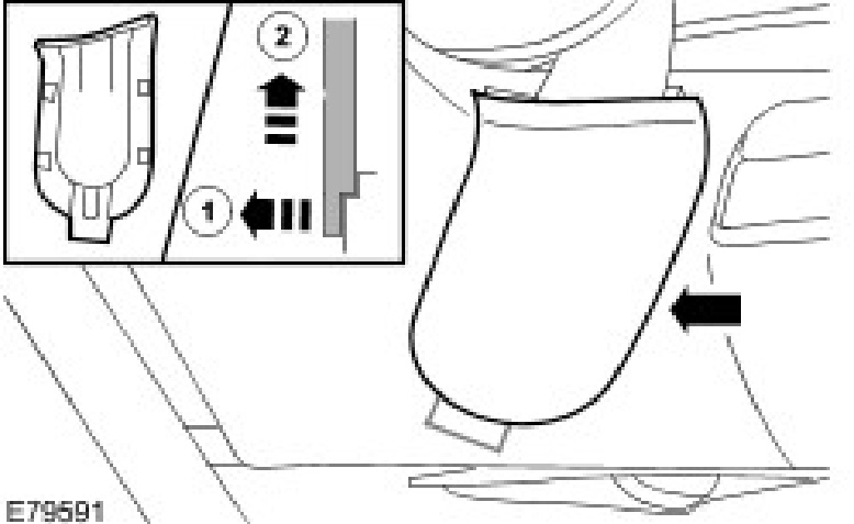 ^ Release the front safety belt lower anchor bolt cover clip upwards and away from the front seat base side trim panel.
