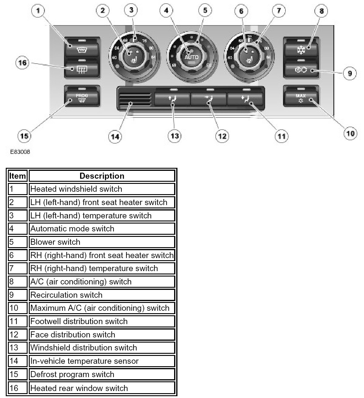 Adjusts the nominal temperature settings of the LH (left-hand) and RH (right-hand) sides of the cabin between 16 and 28 degrees C (60 and 84 degrees F).The temperature range is engraved on the switch surrounds.A pointer on each switch indicates the selected temperature.In the minimum and maximum temperature positions, the system operates at maximum cooling or maximum heating respectively.
