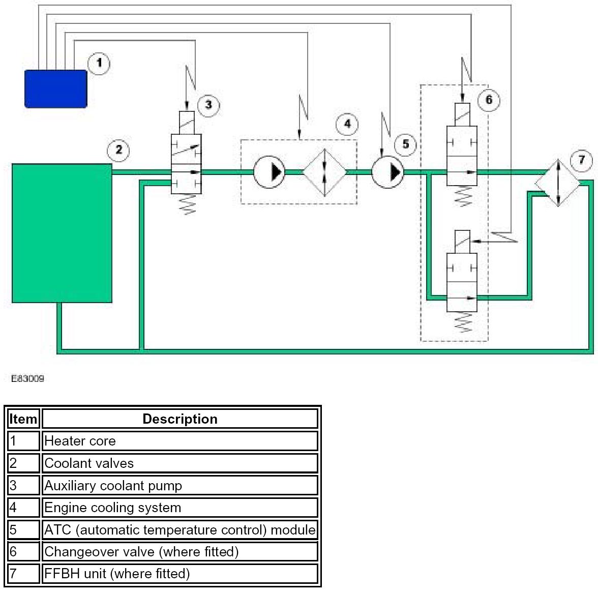 To provide the rest heating function, the ATC (automatic temperature control) module activates the auxiliary coolant pump, coolant valves, control door and blower.The ATC (automatic temperature control) module regulates the temperature (to the driver setting selected before the ignition was switched off), opens the face level distribution doors and runs the blower at speed 4.