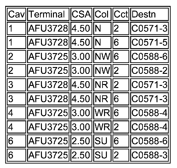 ^ Wire Chart (Pin-out table) - A six column table, giving details of each wire within the connector: