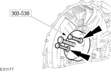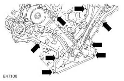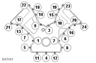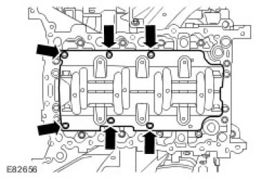 CAUTION: If any new bolts are to be installed to retain the crankshaft main bearing carrier, pre-stress the retaining bolts by installing the crankshaft main bearing carrier without any sealant and tightening the new retaining bolts to the specified torque. Remove the crankshaft main bearing carrier once the bolts have been pre-stressed. Failure to follow this instruction may result in damage to the vehicle.