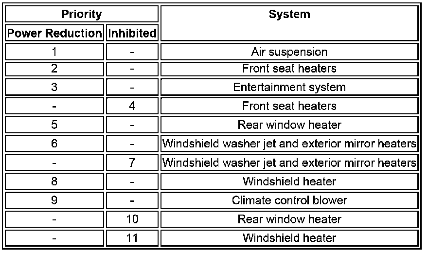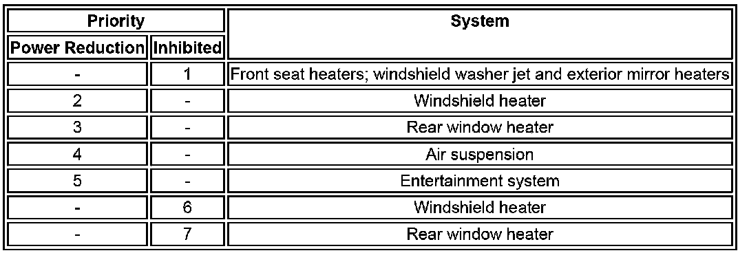 If the electrical load is more than the maximum load available, the ATC (automatic temperature control) module requests an increase of engine idle speed using the medium speed CAN (controller area network) bus message to the ECM (engine control module). If an electrical load imbalance remains after an increase in engine idle speed, or if the electrical load is more than the capacity of the charging system, the ATC (automatic temperature control) module reduces the electrical load by reducing the power of some vehicle systems or inhibiting their operation. The number of systems controlled depends on the electrical load reduction required. The systems controlled, and the order in which their power is reduced or they are inhibited, are contained in three priority tables. The table used depends on the ambient air temperature, battery temperature and ECT (engine coolant temperature) :
