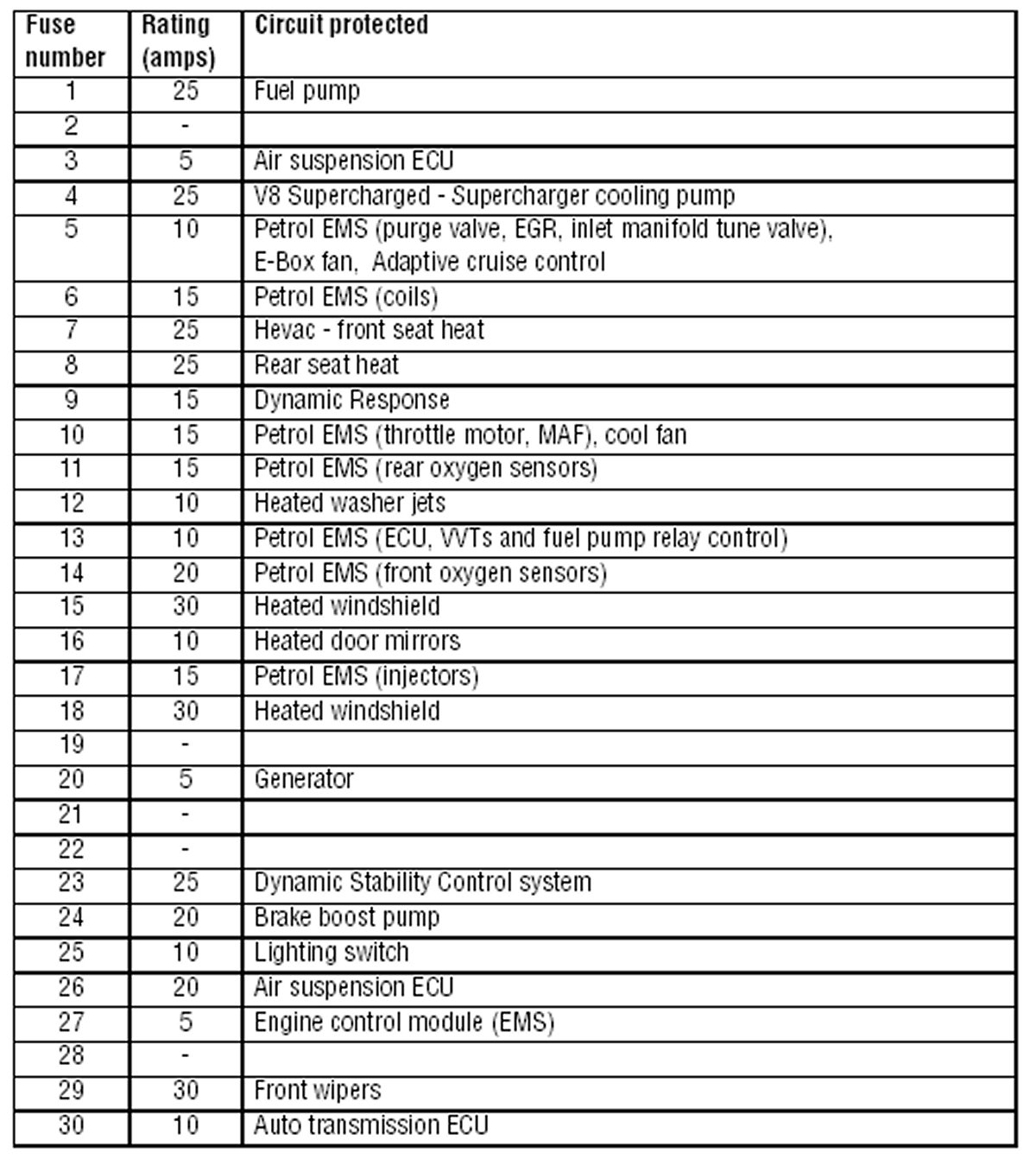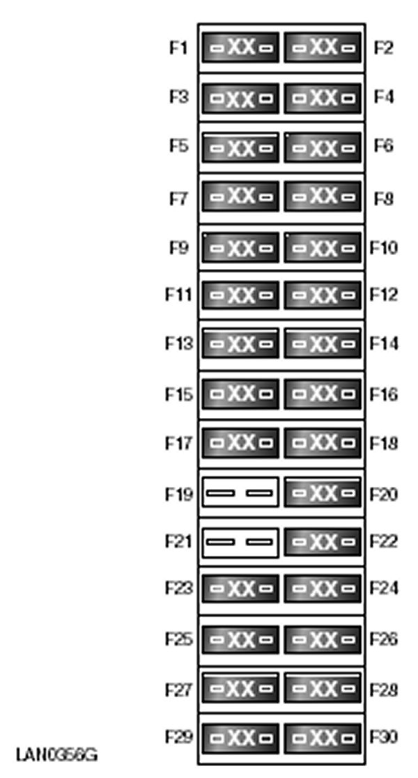 The engine compartment fuse box is located at the rear of the engine bay. To view the fuse box, the under-hood cover will have to be removed. The plastic lid of the box is removed by pressing the plastic tabs in.