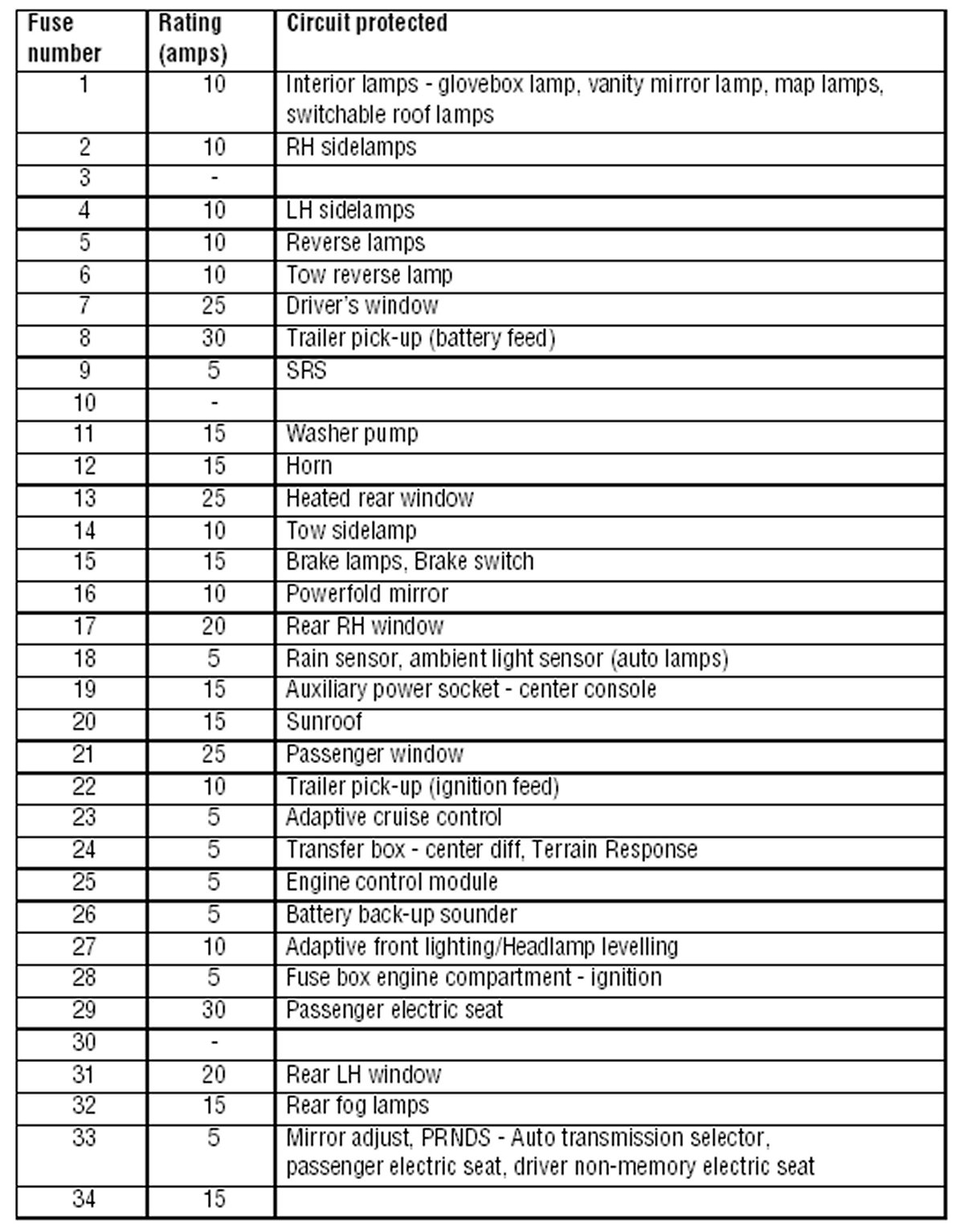 A label on the rear of the glovebox shows the circuits protected, the fuse values and their locations. They are also listed on the following page.