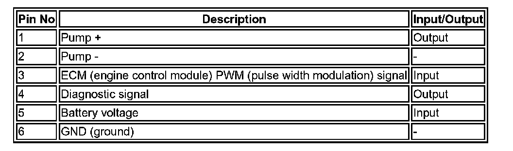The fuel pump is control by the ECM (engine control module). The ECM (engine control module) sends a PWM (pulse width modulation) signal to the fuel pump control module from pin B20 of the ECM (engine control module), the frequency of the signal determines the duty cycle of the pump. the PWM (pulse width modulation) signal to the pump represents half the ON time of the pump. If the ECM (engine control module) transmits a 50% on time the fuel pump control module drives the pump at 100%. If the ECM (engine control module) transmits a 5% ON time the fuel pump control module drives the pump at 10%. The fuel pump control module will only turn the fuel pump ON if it receive a valid signal between 4% and 50%. When The ECM (engine control module) requires the fuel pump to be turned OFF the ECM (engine control module) transmits a duty cycle signal of 75%.