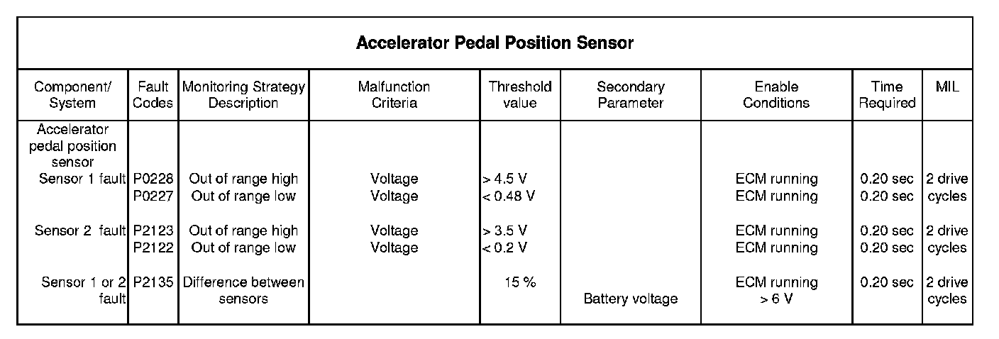 During ignition on conditions the voltages from the two-track accelerator pedal position sensor is monitored. Both tracks are independently monitored for out of range high and low conditions.
