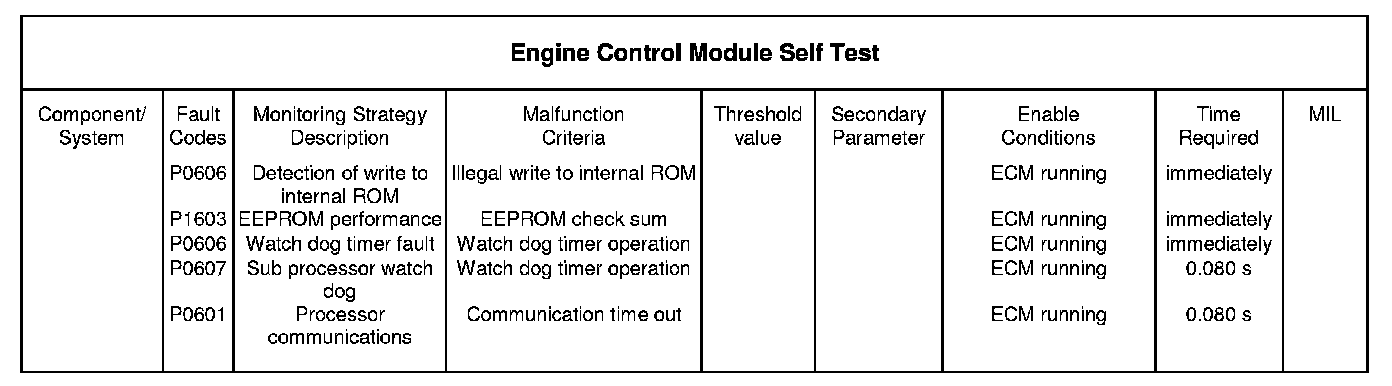 The ECM performs a number of self checks on both the its Random Access Memory (RAM), Read only Memory (RAM) and the two central processor units it uses to control the engine management system. A failure of any of the self-checks will require the ECM to be replaced.