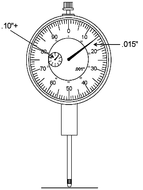 The illustration below shows a typical .001 inch indicator with rev counter. In this example, the dial gauge was preloaded to .10" and reads .015" from the zero point on the dial.