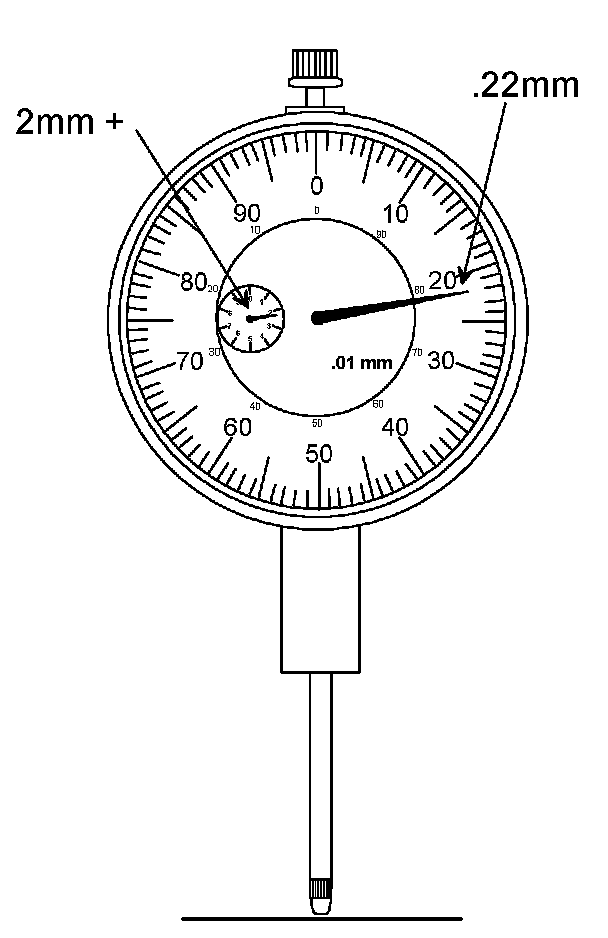 Note in the example below that the tool was preloaded to 2.0 mm and has traveled .22 mm from the zero point on the dial.