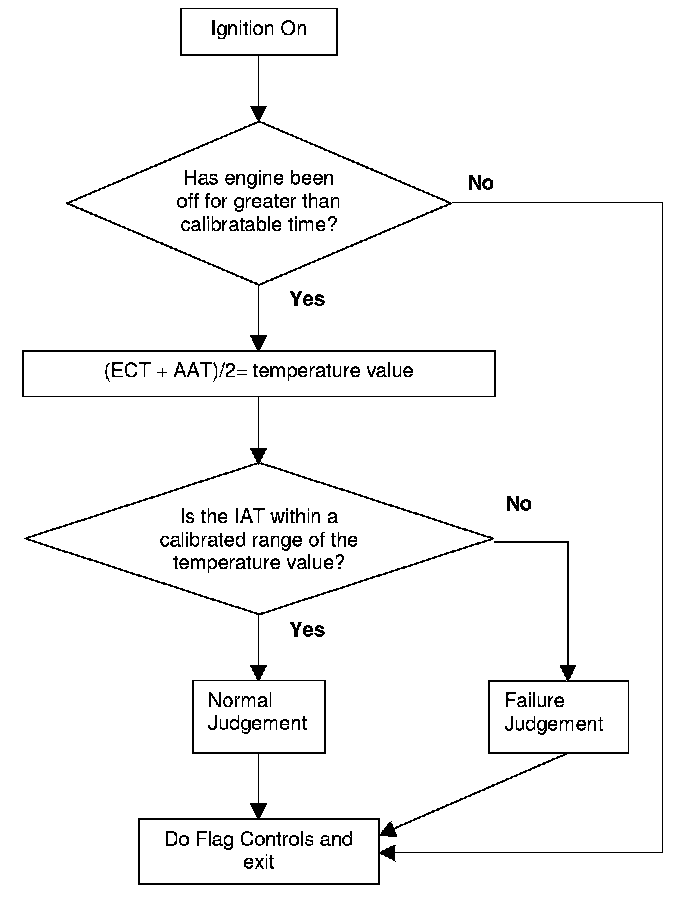 If the engine has been off for greater than a calibrated time period, then the IAT sensor reading is compared to the average of the sum of the ECT sensor and AAT sensor. The IAT sensor must be within a calibrated threshold of this reading for a normal judgement to be made. If it is outside this threshold then a failure is flagged.