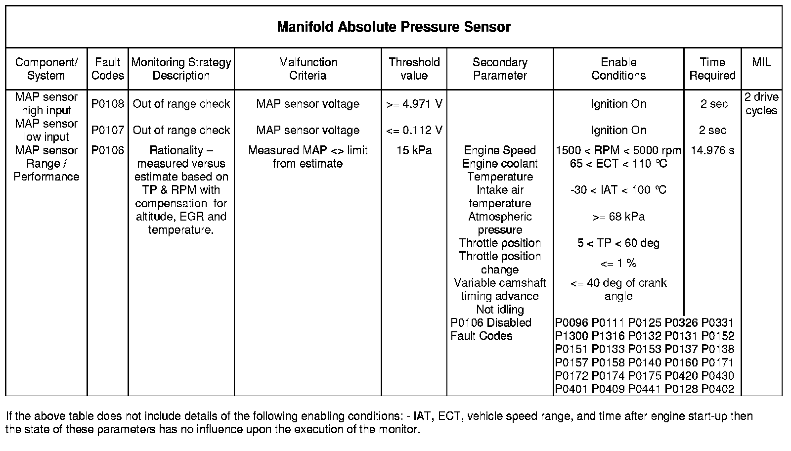 The monitor runs continuously so long as the entry conditions are met. The Manifold Absolute Pressure (MAP) Sensor monitor compares the measured manifold absolute pressure with an estimated pressure, which is calculated by a model. The model that calculates the estimated pressure uses a look-up table which have engine speed and throttle angle as inputs. These are used to derive base and compensation values for intake air temperature, atmospheric pressure, EGR rate and VVT, from which the estimated pressure is calculated.