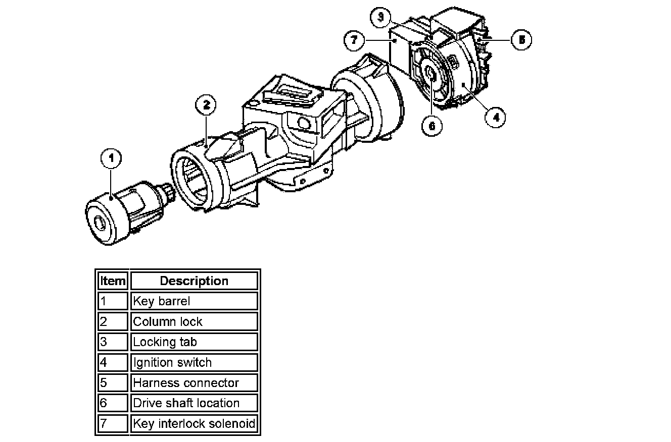 On vehicles with automatic transmission. a solenoid is located on the side of the ignition switch. The solenoid, which is controlled on a single wire from the transfer box control module, prevents the key from being removed from the key barrel if the transmission selector lever is not in the PARK (P) position. The transfer box receives the transmission position status via a message transmitted from the transmission control module on the CAN bus.