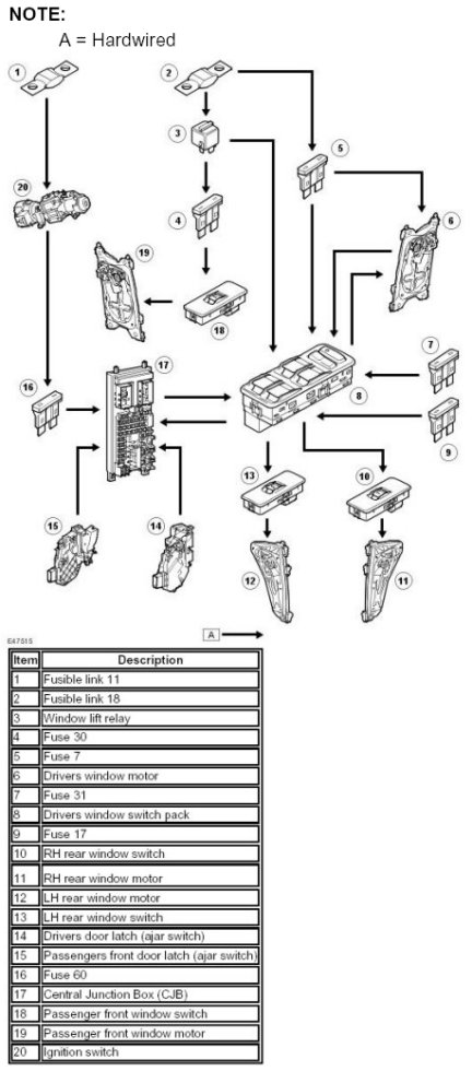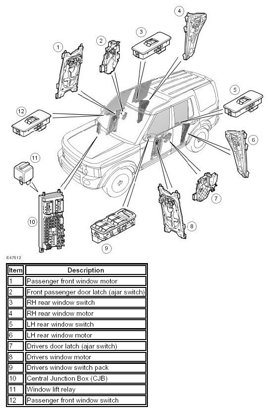 Electric windows are installed in all four doors. The drivers front window incorporates a self-contained 'Anti-trap' regulator, which features one-shot up and one-shot down functionality. All the passenger windows are hard wired and are powered via the window lift relay in the Central Junction Box (CJB). The one-shot and one-shot down feature is also fitted to the front passenger window of vehicles from 2007 model year onwards.