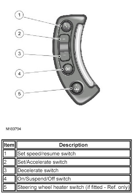 The speed control switches are located on the RH (right-hand) side of the steering wheel. The switches are connected via flyleads directly to the clock spring. All of the speed control switches are non-latching momentary switches.