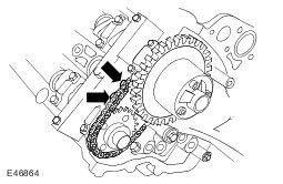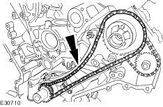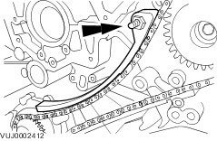 ^ Install the RH secondary timing chain tensioner and the secondary timing chain to the camshaft sprockets.