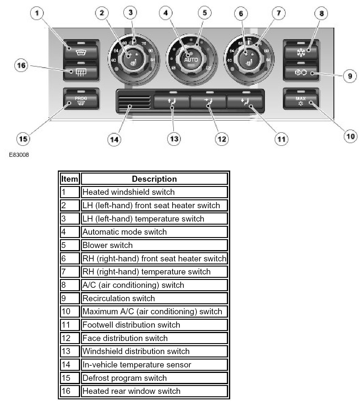 Adjusts the nominal temperature settings of the LH (left-hand) and RH (right-hand) sides of the cabin between 16 and 28 degrees C (60 and 84 degrees F). The temperature range is engraved on the switch surrounds. A pointer on each switch indicates the selected temperature. In the minimum and maximum temperature positions, the system operates at maximum cooling or maximum heating respectively.