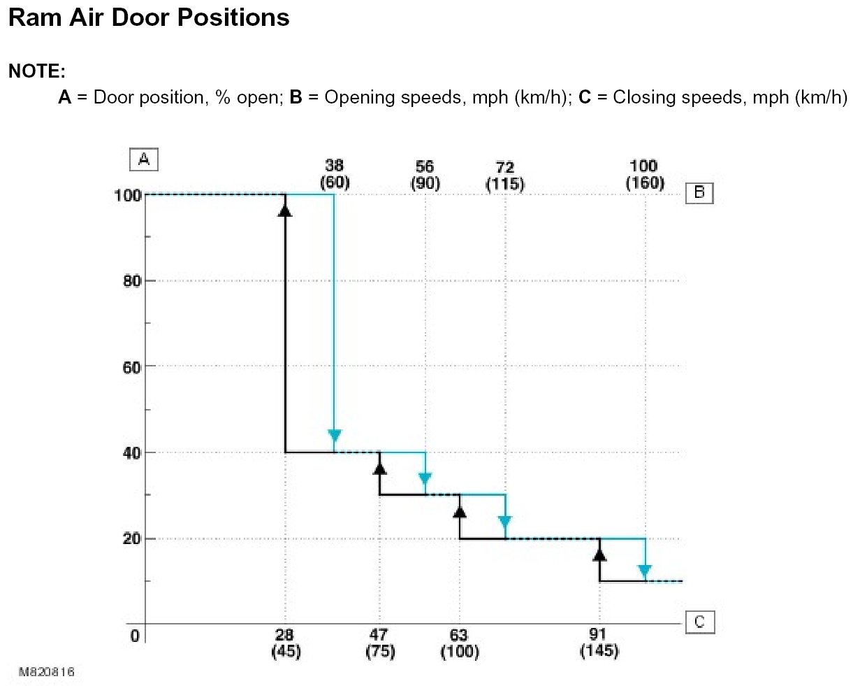 The ATC (automatic temperature control) module progressively closes the ram air doors, in four steps, as vehicle speed increases, and opens them again as vehicle speed decreases. At the maximum closed position, 90% of the fresh air inlet area is closed off. A hysteresis of 15 km/h (9 mph) prevents the ram air doors from hunting at a constant vehicle speed.