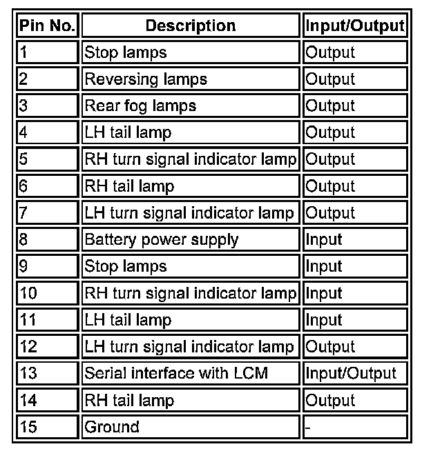 The LCM communicates with the trailer module via a bi-directional, dedicated serial link. The rear fog lamps and reversing lamps are controlled on this link. The trailer module also uses this link to transmit error messages for the trailer lamps to the LCM.