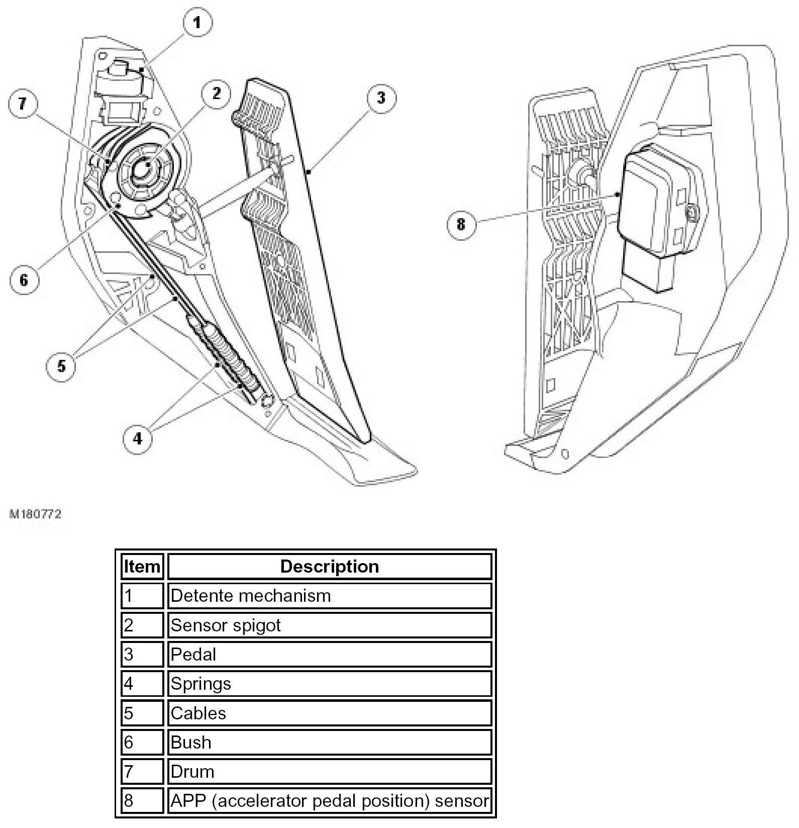 The APP (accelerator pedal position) sensor is located in plastic housing which is integral with the throttle pedal. The housing is injection molded and provides location for the APP (accelerator pedal position) sensor. The sensor is mounted externally on the housing and is secured with 2 Torx screws. The external body of the sensor has a 6 pin connector which accepts a connector on the vehicle wiring harness.