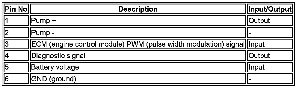 The ECM (engine control module) sends a PWM (pulse width modulation) signal to the FPDM (fuel pump driver module) from pin 20 of connector C0635 of the ECM (engine control module), the duty cycle of the signal determines the duty cycle of the pump. The ECM (engine control module) sets a target fuel pressure based on engine load. The target fuel pressure is maintained by using feedback from the fuel rail pressure sensor which is used to control the fuel pump via a closed loop PWM (pulse width modulation) signal. The PWM (pulse width modulation) signal to the pump represents half the ON time of the pump. If the ECM (engine control module) transmits a 50% on time the fuel pump control module drives the pump at 100%. If the ECM (engine control module) transmits a 5% ON time the fuel pump control module drives the pump at 10%. The fuel pump control module will only turn the fuel pump ON if it receives a valid signal between 4% and 50%. When the ECM (engine control module) requires the fuel pump to be turned OFF the ECM (engine control module) transmits a duty cycle signal of 75%.