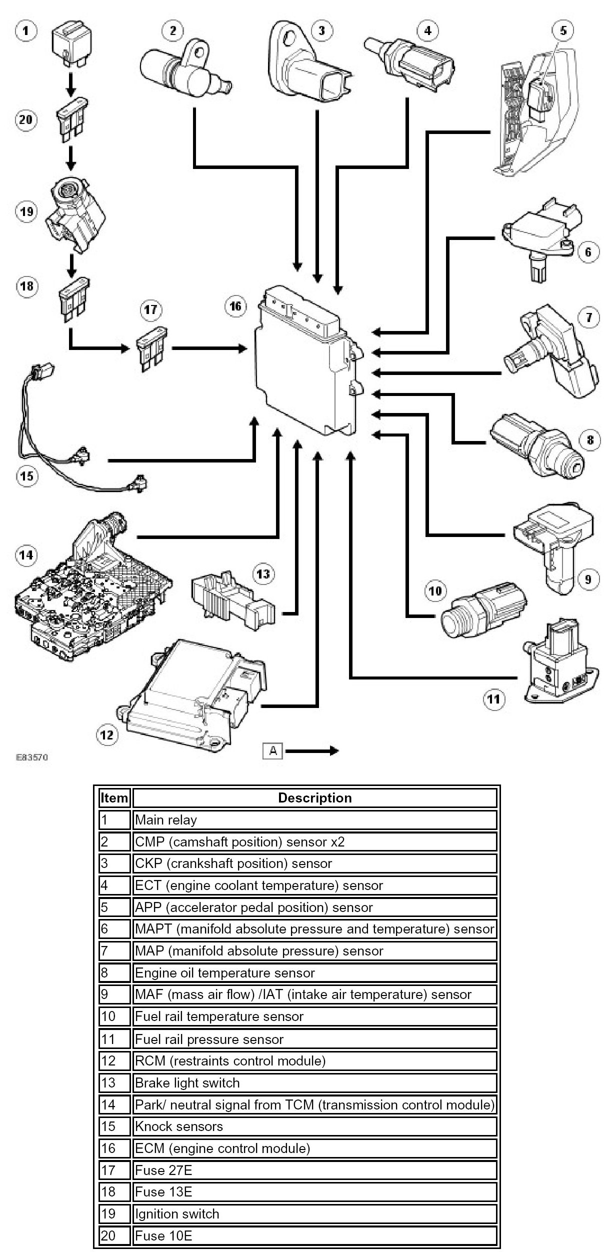The V8 engine is fitted with eight plug-top coils that are driven directly by the ECM (engine control module). This means that the ECM (engine control module), at the point where sufficient charge has built up, switches the primary circuit of each coil and a spark is produced in the spark plug. The positive supply to the coil is fed from a common fuse. Each coil contains a power stage to trigger the primary current. The ECM (engine control module) sends a signal to each of the coils power stage to trigger the power stage switching. Each bank has a feedback signal that is connected to each power stage. If the coil power stage has a failure the feedback signal is not sent, causing the ECM (engine control module) to store a fault code appropriate to the failure.
