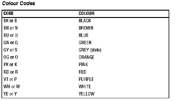 Connectors and header joints are identified by their corresponding connector number with a numbered suffix to indicate the pin-out detail of the wire, i.e. C0292-1 identifies connector 292, pin number 1. Wire insulation colours are listed in a table at the end of this section. Where wires have a predominant colour with a secondary colour tracer, the main colour is identified first, i.e. WH-BK - white with a black tracer.