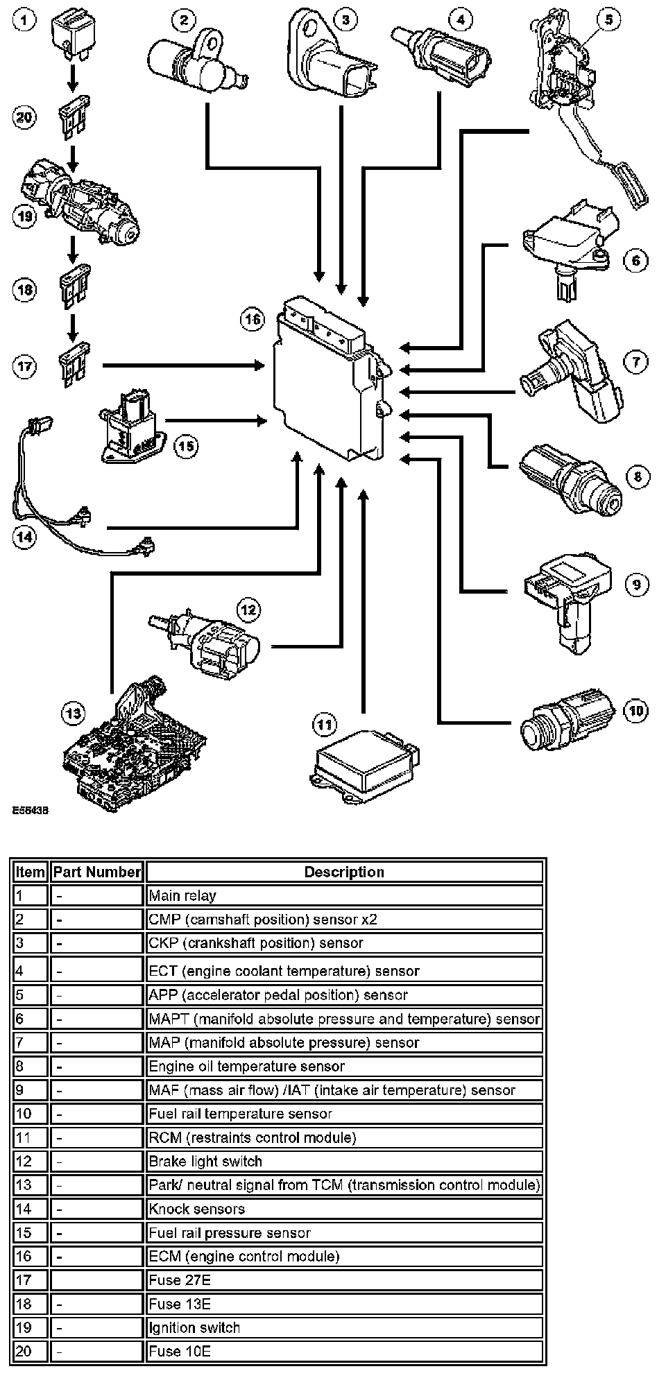 The ECM (engine control module) uses a torque-based strategy to generate the torque required by the driver and other vehicle control modules. The EMS uses various sensors to determine the torque required from the engine. The EMS also interfaces with other vehicle electronic control modules's, via the CAN (controller area network) bus, to obtain additional information (e.g. road speed from the ABS (anti-lock brake system) control module). The EMS processes these signals and decides how much torque to generate. Torque is then generated by using various actuators to supply air, fuel and spark to the engine (electronic throttle, injectors, coils, etc.).