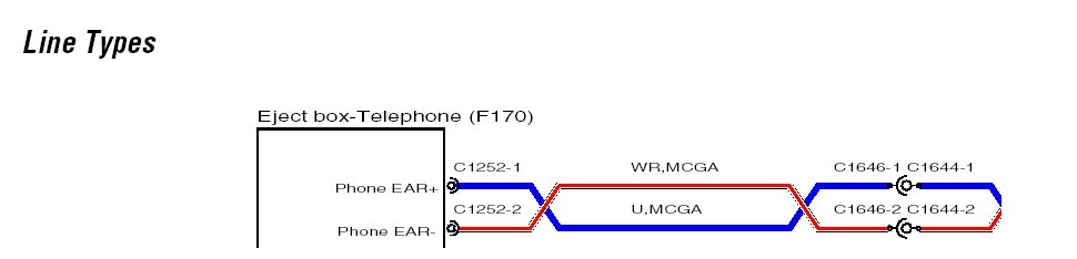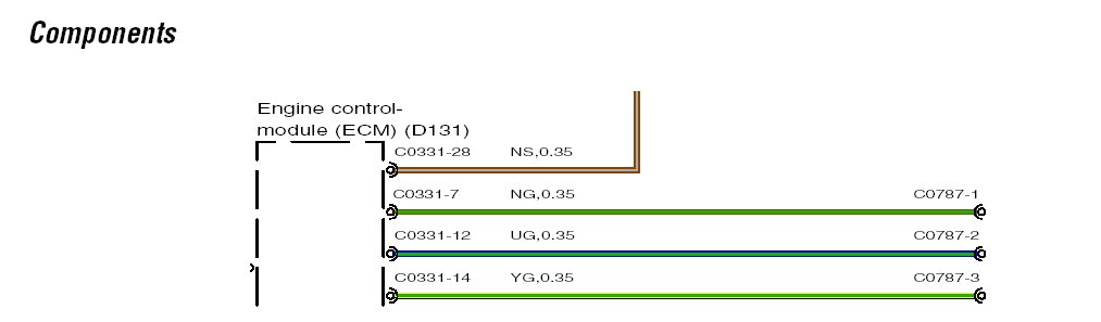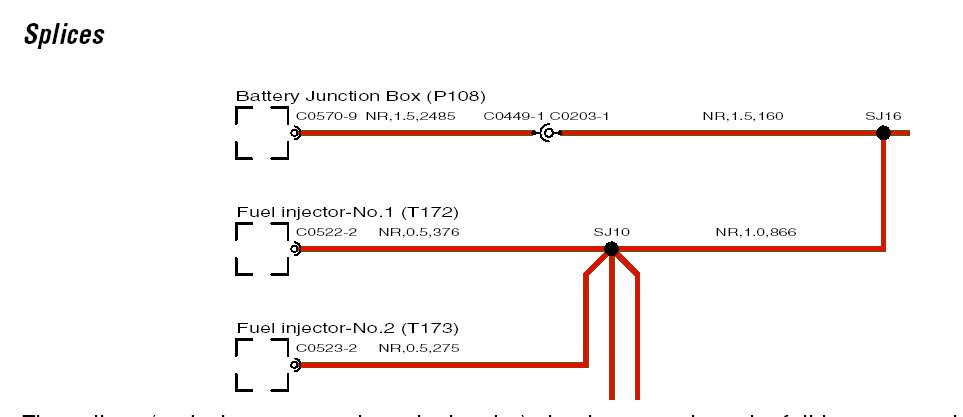 The wire length (in millimetres) is displayed after the colour and cross sectional area; for example, SR,0.35,480. In this example, the figure, 480 indicates the approximate position of the harness splice is 480 mm from connector C2335.