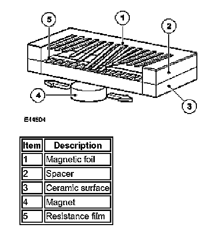 The film resistors are arranged in a linear arc with resistance ranging from 51.2 to 992.11 Ohms. The electrical output signal is output proportional to the amount of fuel in the tank and the position of the float arm. The measured resistance is processed by the instrument cluster to implement an anti-slosh function. This monitors the signal and updates the fuel gage pointer position at regular intervals, preventing constant pointer movement caused by fuel movement in the tank due to cornering or braking.