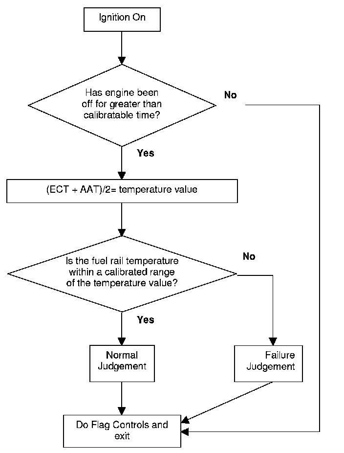 If the engine has been off for greater than a calibrated time period, then when the ignition is next switched on, the fuel rail temperature sensor reading is compared to the average of the sum of the ECT sensor and AAT sensor. The fuel rail temperature sensor must be within a calibrated threshold of this reading for a normal judgement to be made. If it is over this threshold, then a fault will be detected.