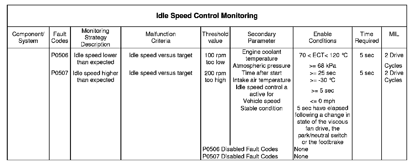 If the above table does not include details of the following enabling conditions: - IAT, ECT, vehicle speed range, and time after engine start-up then the state of these parameters has no influence upon the execution of the monitor.