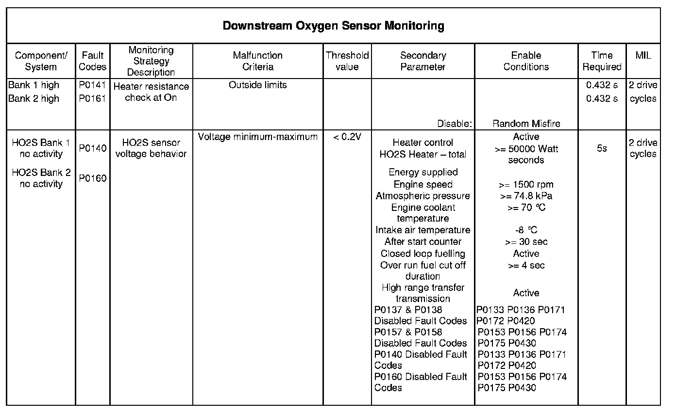 This monitor is designed to detect continuous and intermittent faults with the upstream oxygen sensor signals. The monitor will operate continuously provided the entry conditions are met and the monitor is not inhibited for any of the reasons listed in the table.