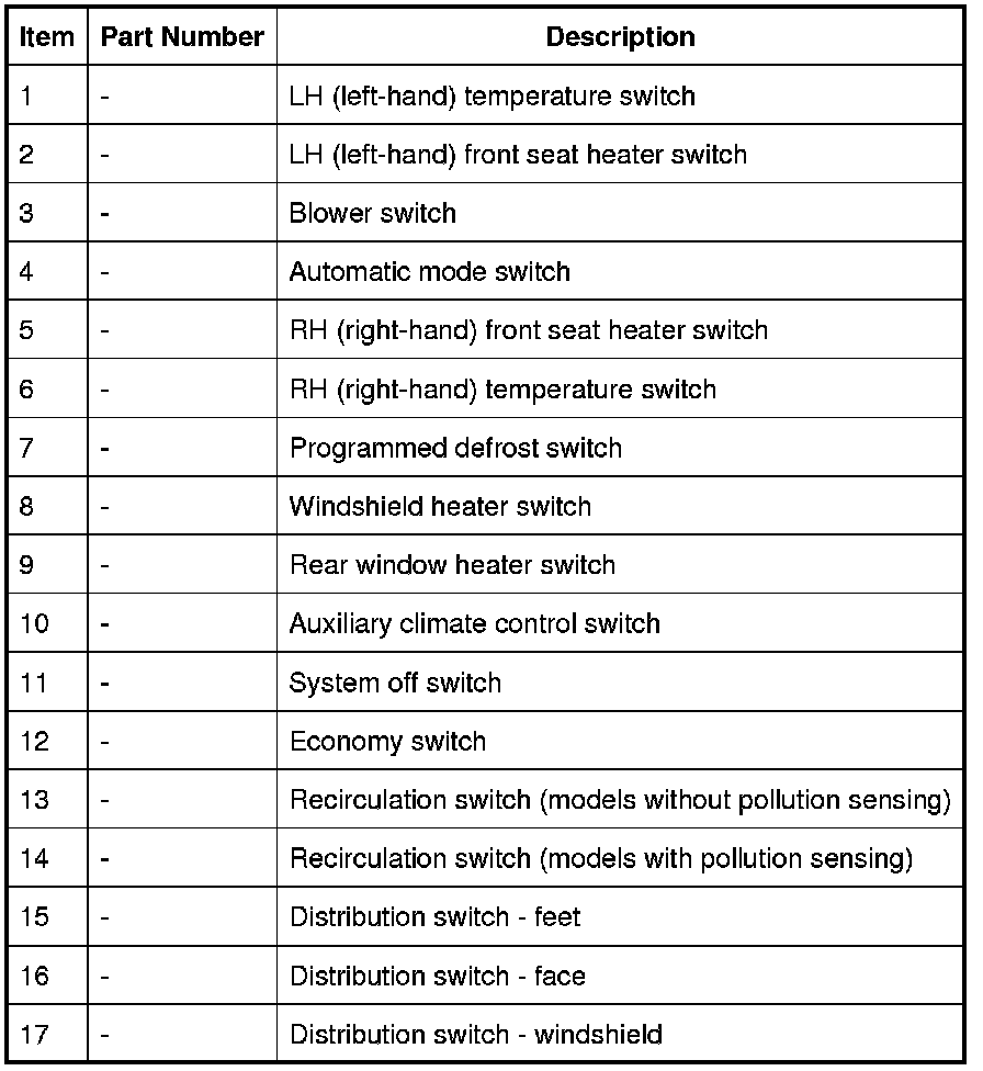 Either a manual or an automatic control system is installed in the vehicle. The manual system maintains a constant heater outlet temperature, to both sides of the passenger compartment, with manual control of the intake air source, blower speed and air distribution. The automatic system automatically adjusts the temperature, volume and distribution of the air from the heater to maintain the individual temperature levels selected for the LH (left-hand) and RH (right-hand) sides of the passenger compartment. The automatic system also has manual overrides for the intake air source, blower speed and air distribution. The manual and automatic systems both include: