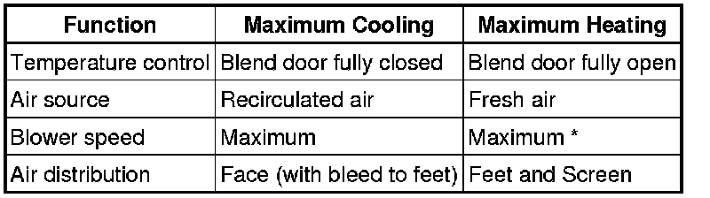 When maximum cooling or maximum heating is selected, the ATC (automatic temperature control) module overrides any previously selected options and sets the temperature, air source, blower speed and air distribution as detailed in the following table.