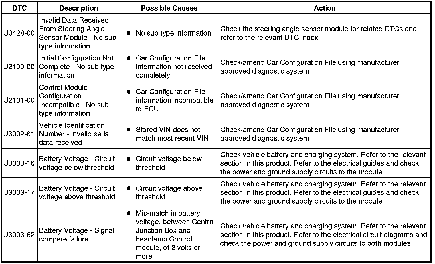 The table below lists all Diagnostic Trouble Codes (DTCs) that could be logged in the Headlamp Control Module, for additional Diagnosis and Testing information refer to the relevant Diagnosis and Testing Section. For additional information, refer to Headlamps Headlamps