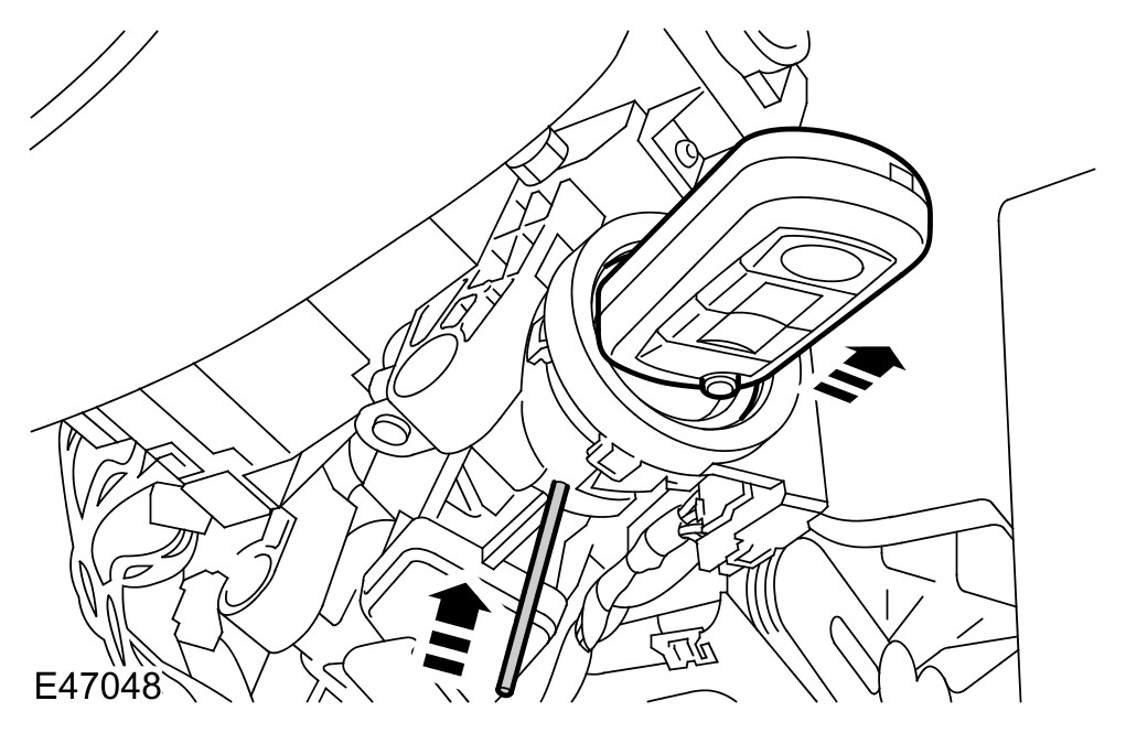 - Insert a pin, not exceeding 2 mm diameter, through the access hole in the ignition lock cylinder housing to depress the plunger, and release the ignition lock cylinder.
