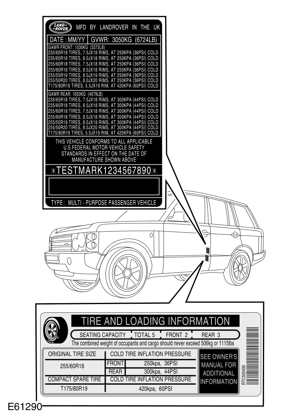 - 4. NAS/Canada - On the Tire Data/Specification label attached to the front of the LH B-pillar.