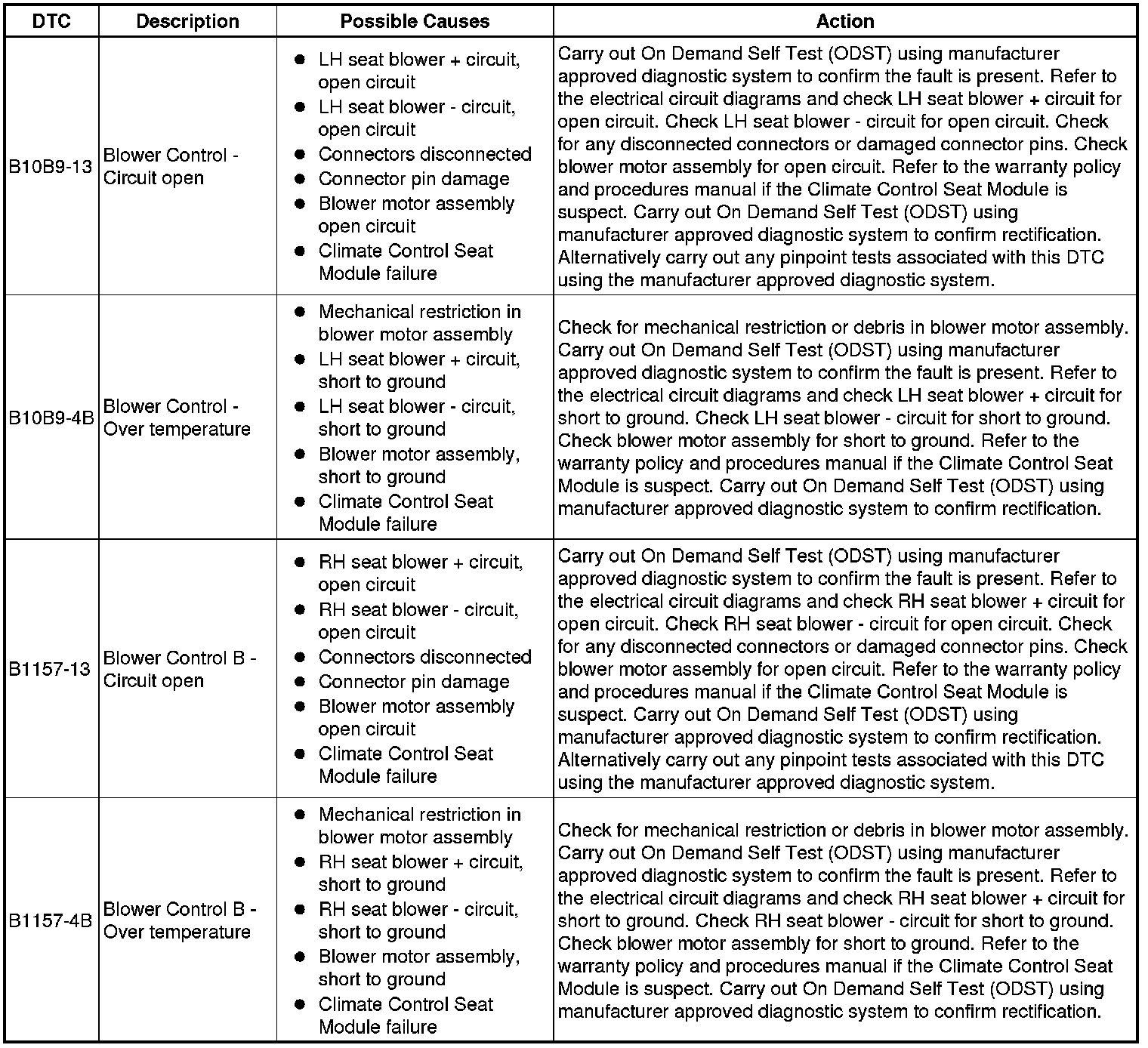 The table below lists all Diagnostic Trouble Codes (DTCs) that could be logged in the Climate Controlled Seat Module - Front/Rear (SCME/SCMF), for additional Diagnosis and Testing information refer to the relevant Diagnosis and Testing Section. For additional information, refer to Seats Initial Inspection and Diagnostic Overview