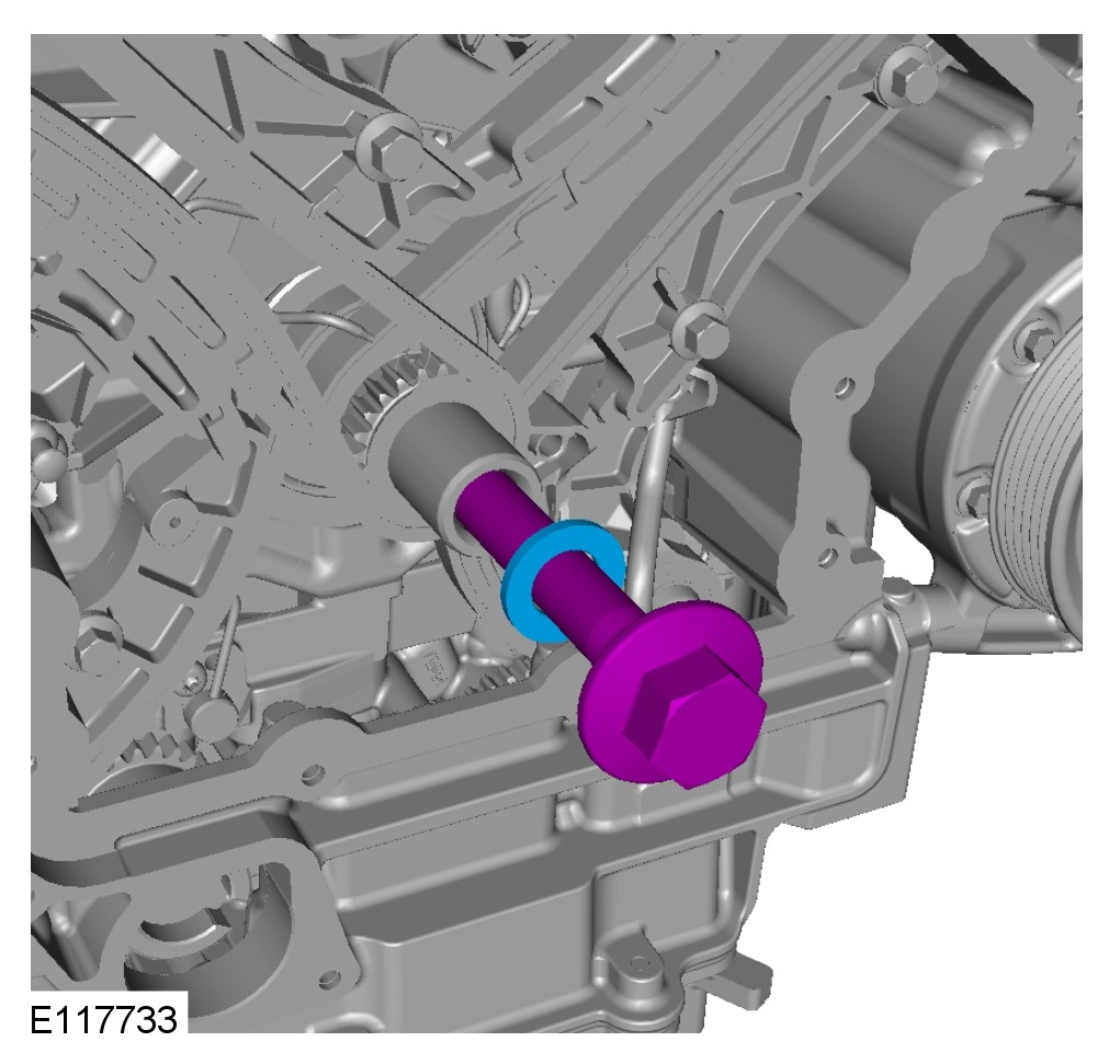 CAUTION: Install the crankshaft pulley bolt with an M16 washer to prevent damage to the crankshaft on installation.