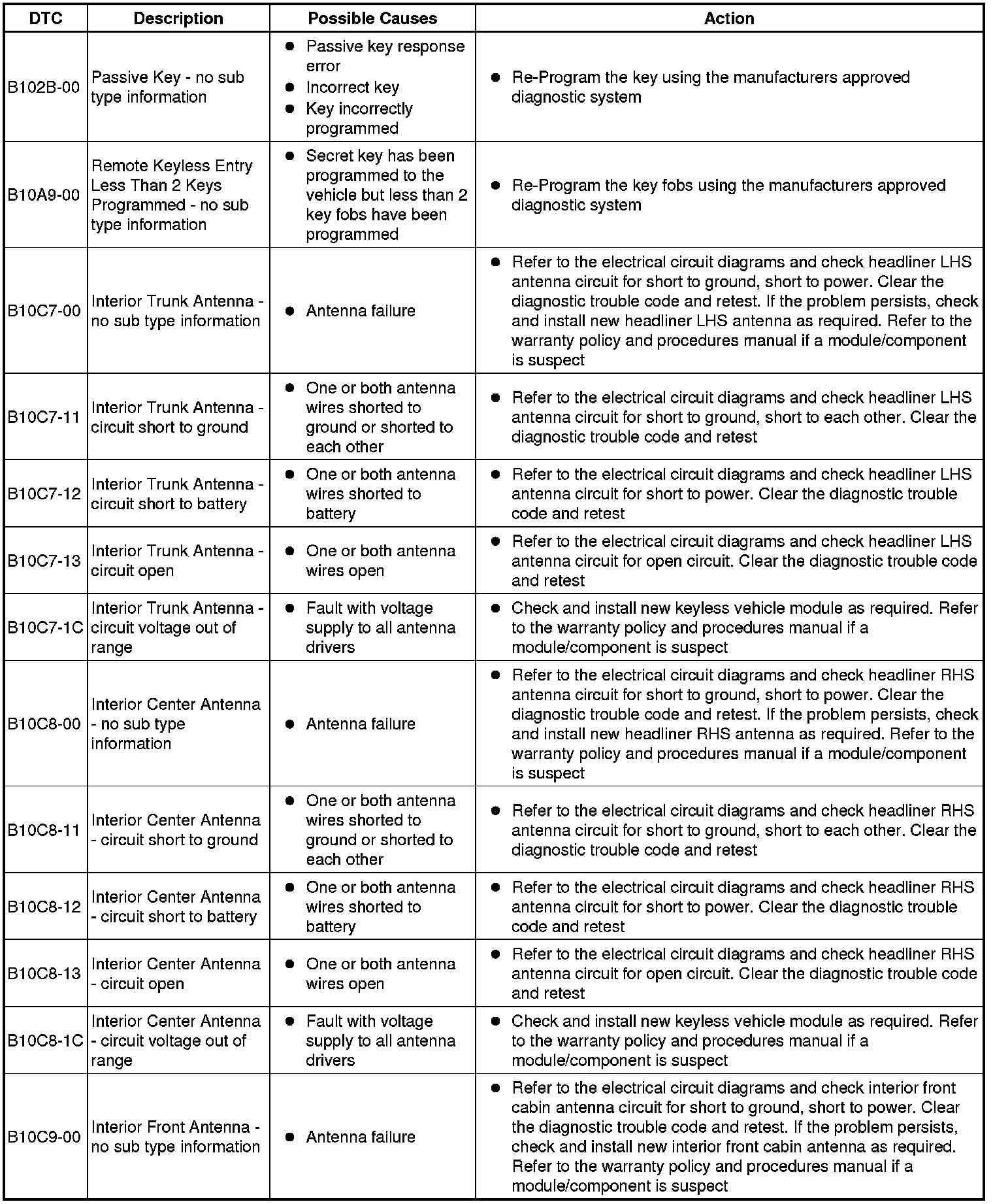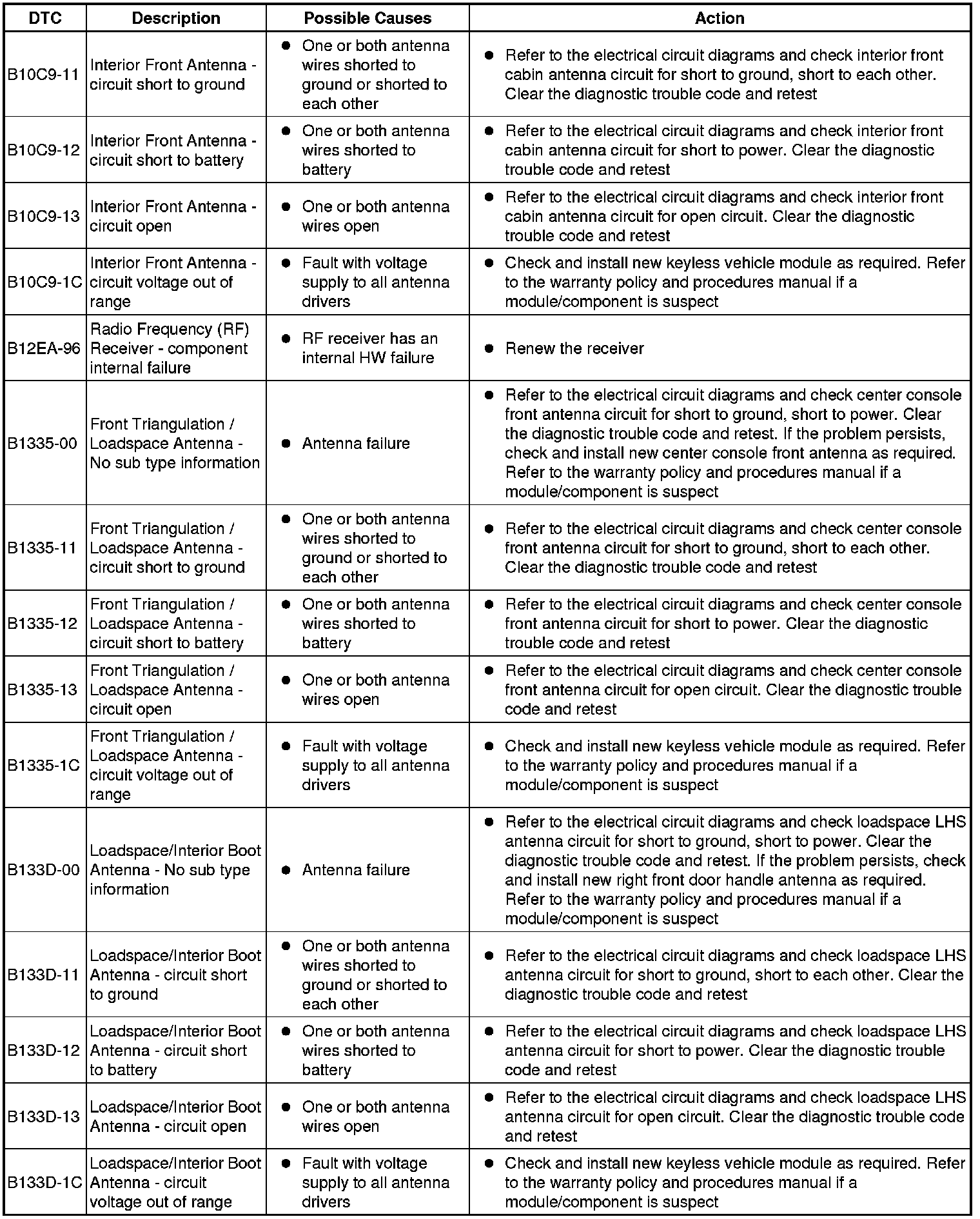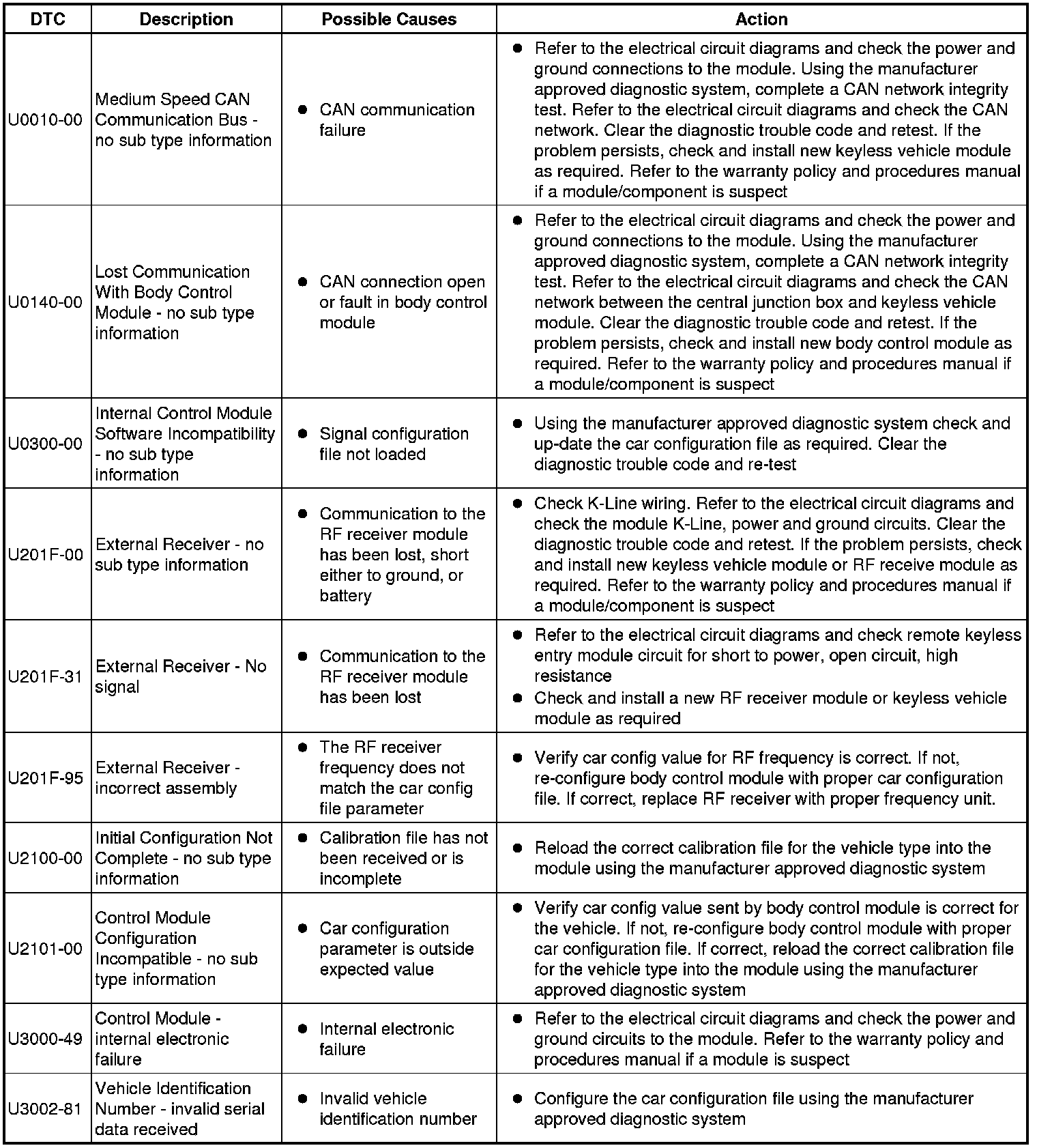 The table below lists all Diagnostic Trouble Codes (DTCs) that could be logged in the Remote Function Actuator Module, for additional Diagnosis and Testing information refer to the relevant Diagnosis and Testing Section. For additional information, refer to Locks, Latches and Entry Systems Initial Inspection and Diagnostic Overview