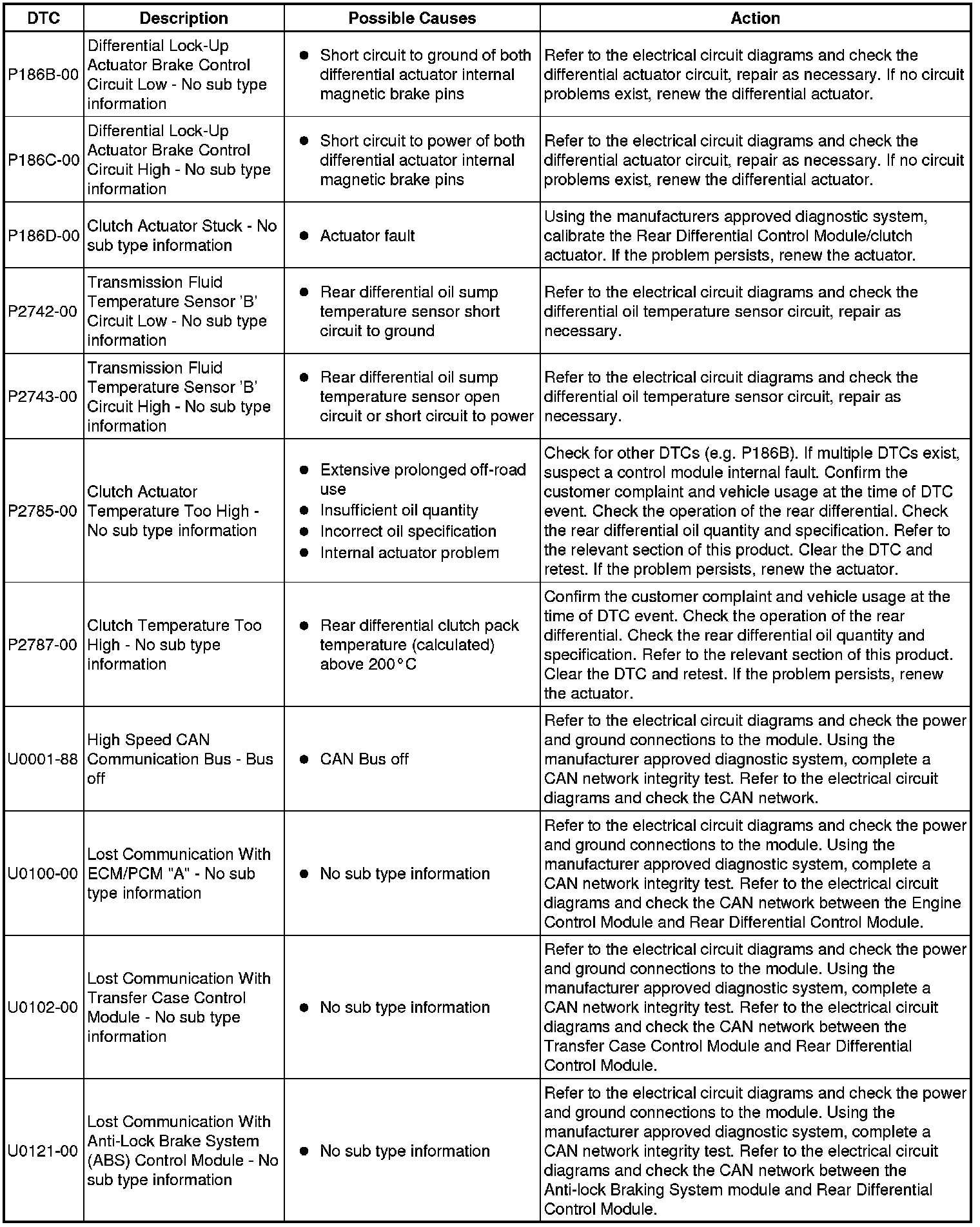 The table below lists all Diagnostic Trouble Codes (DTCs) that could be logged in the Rear Differential Control Module, for additional Diagnosis and Testing information refer to the relevant Diagnosis and Testing Section. For additional information, refer to Rear Drive Axle and Differential Initial Inspection and Diagnostic Overview