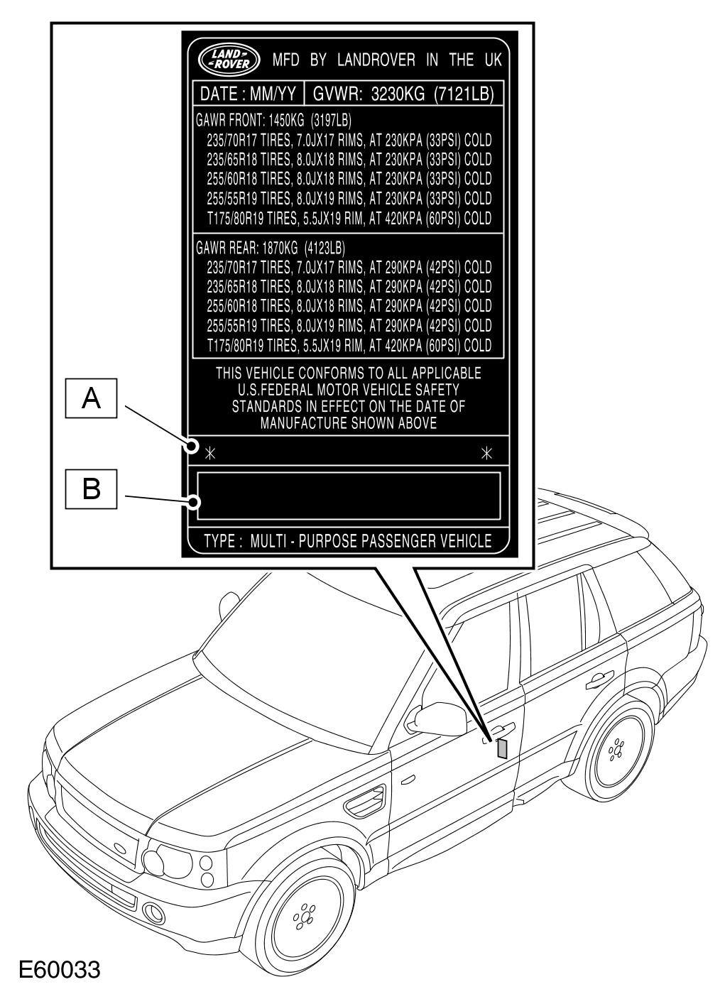 - 4. NAS/Canada - On the Tire Data/Specification label attached to the front of the LH B-pillar.
