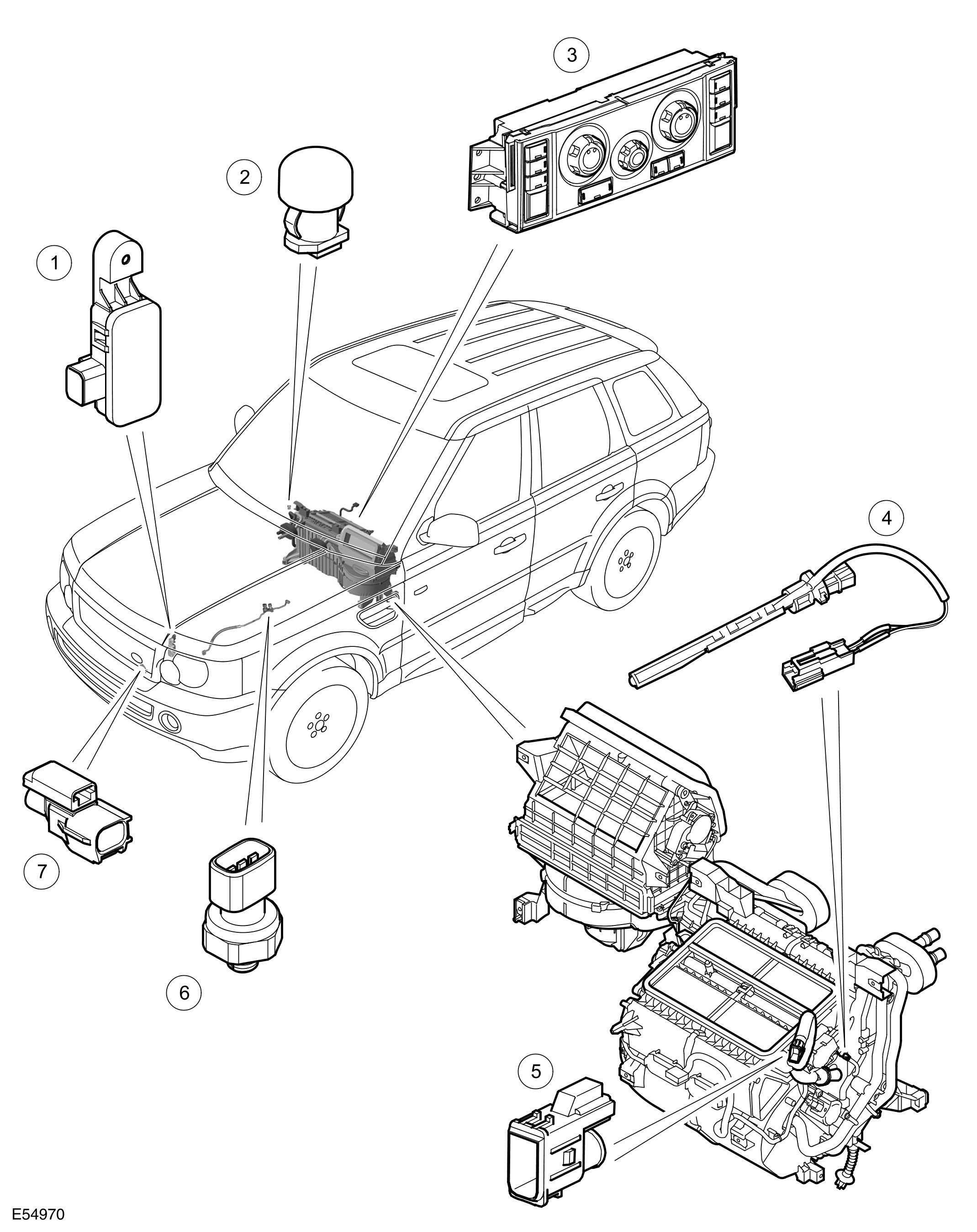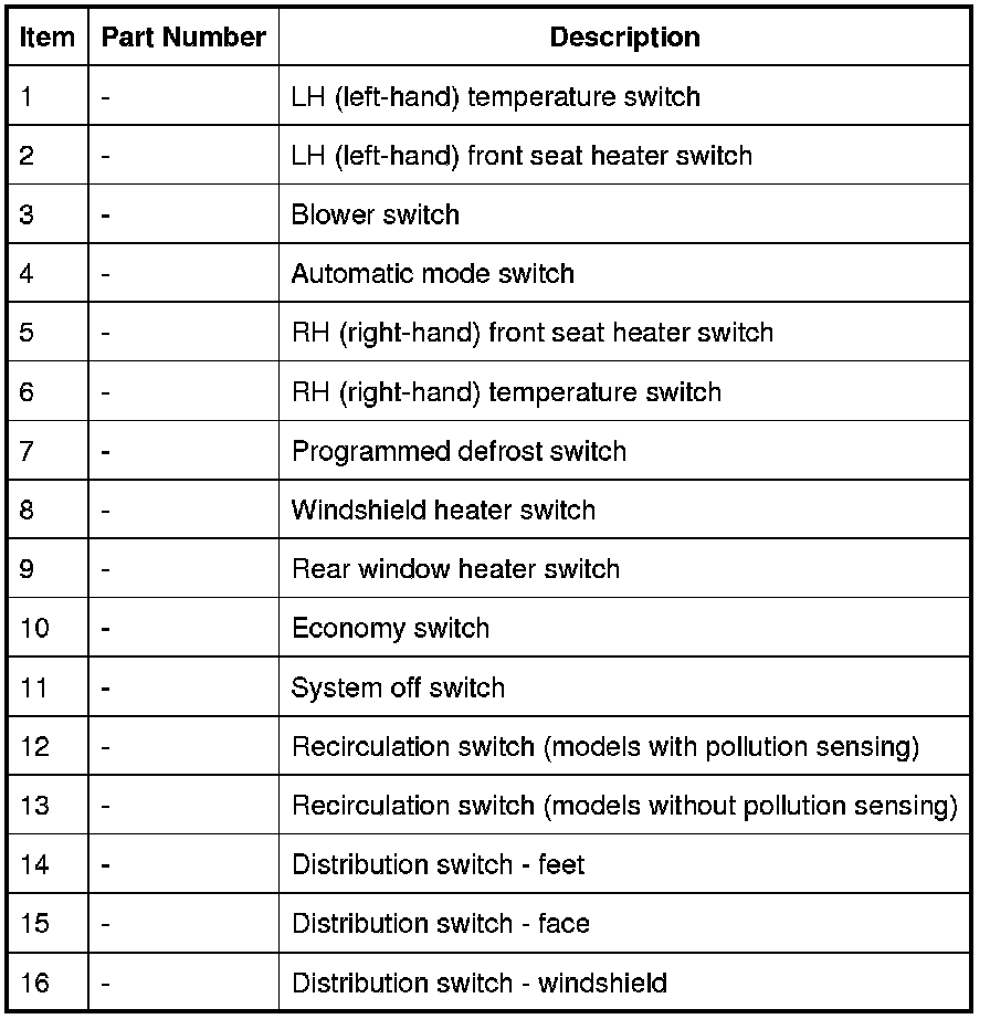 The system is a dual zone system that automatically adjusts the temperature, volume and distribution of the air from the heater to maintain the individual temperature levels selected for the LH (left-hand) and RH (right-hand) sides of the passenger compartment. The system also has manual overrides for the intake air source, blower speed and air distribution. The system includes: