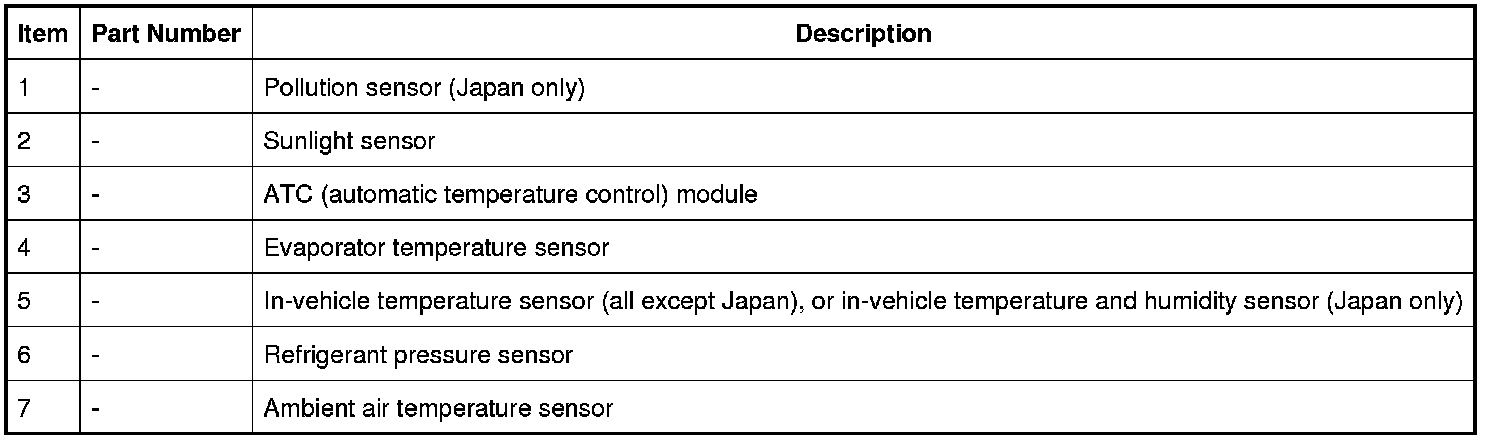 The sunlight sensor consists of two photoelectric cells that provide the ATC (automatic temperature control) module with inputs of light intensity, one as sensed coming from the left of the vehicle and one as sensed coming from the right. The inputs are a measure of the solar heating effect on vehicle occupants, and are used by the ATC (automatic temperature control) module to adjust blower speed, temperature and distribution to improve comfort. The sensor is installed in the center of the instrument panel upper surface and is powered by a 5V feed from the ATC (automatic temperature control) module.